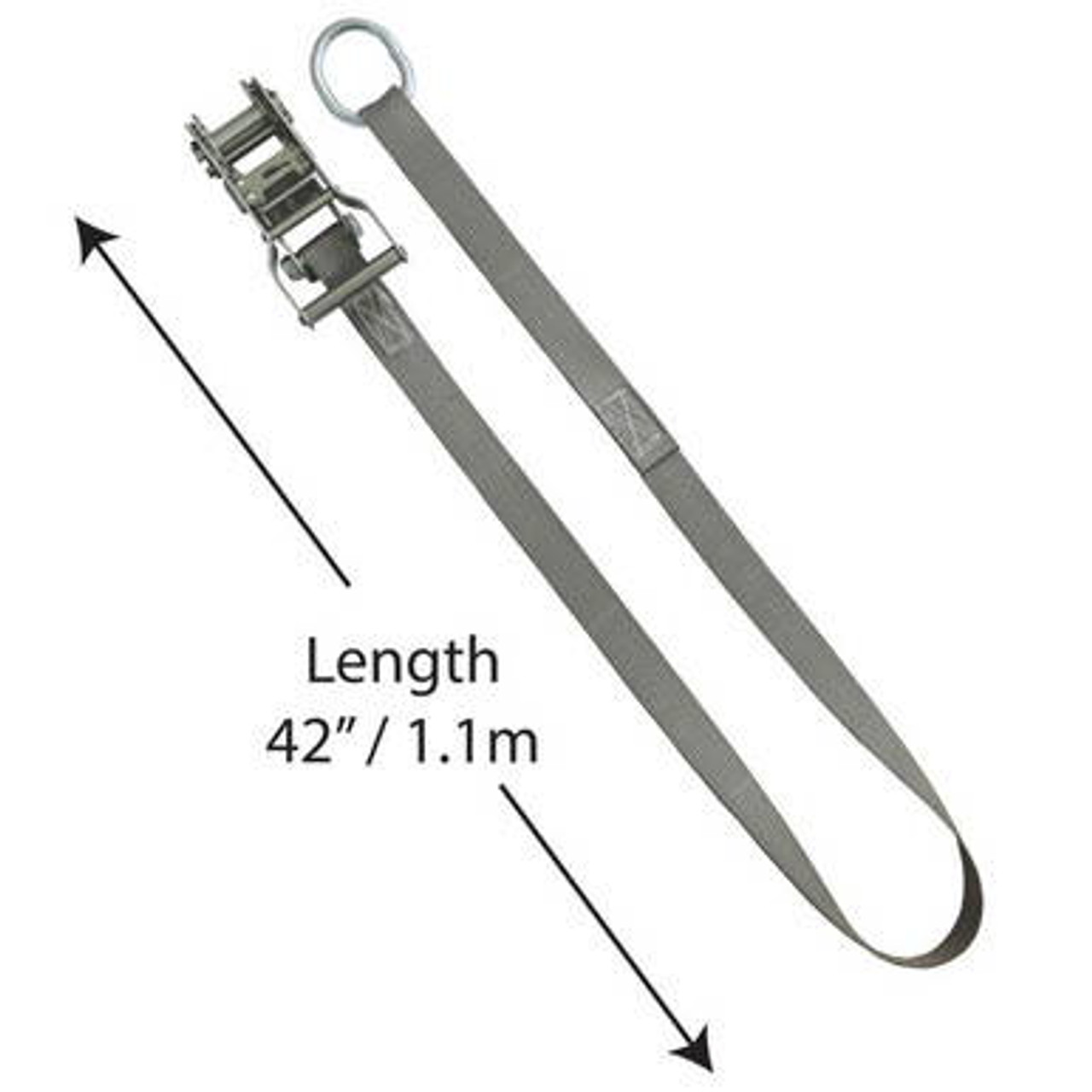 The 1” Ratchet Assembly is used on a Pinnacle Series Cross Cable Tent to secure the tent top to the base plates. Each Ratchet Assembly Bottom is 42” long, made from 1” gray webbing and equipped with a 1” ratchet at one end and a 1.5” O-ring on the other. All hardware has a silver finish. This end of the assembly is hooked to the base plate at the O-ring end, and connects to the plain strap of the top portion.