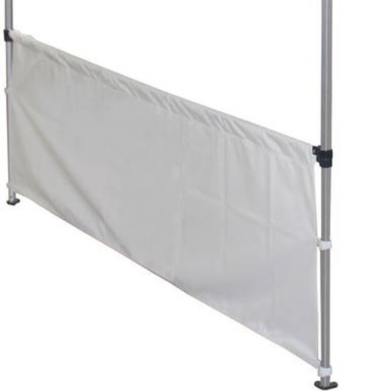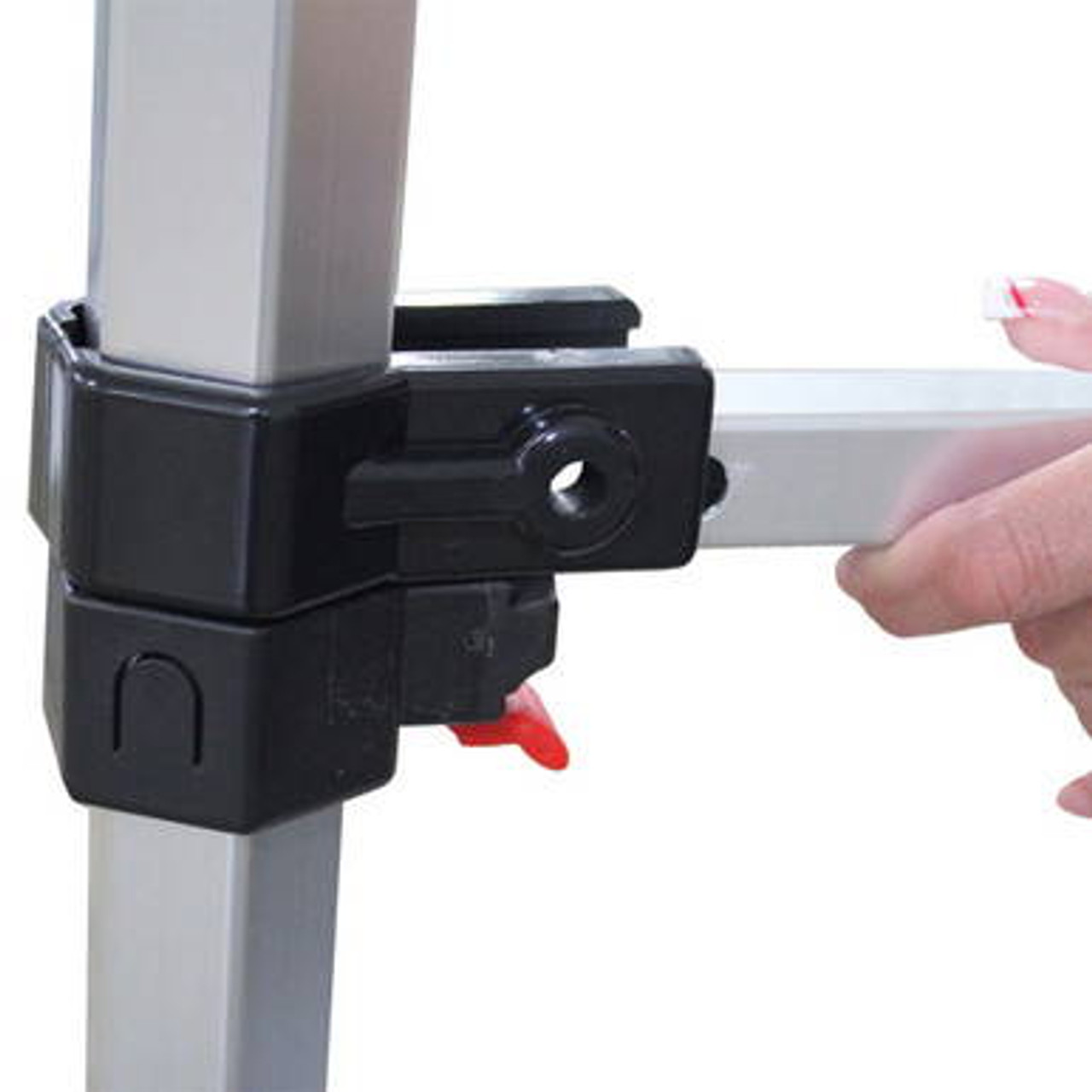 Used in conjunction with the Fast Shade Rail Skirts, the 10' (3.05 m) Rail Skirt Aluminum Fitting hardware attaches to an aluminum Fast Shade frame around adjacent legs. Due to frame design, the hexagon-shaped legs will not be mirror-images of each other, necessitating two different styles of end clamps for the fitting: an angled clamp and a straight clamp. Both clamps operate by wrapping around the leg, then inserting the fitting bar between the protrusion of the clamp, making sure that all holes line up. Once aligned, a bolt is inserted into the side of the clamp without a nut, and the bolt is tightened.