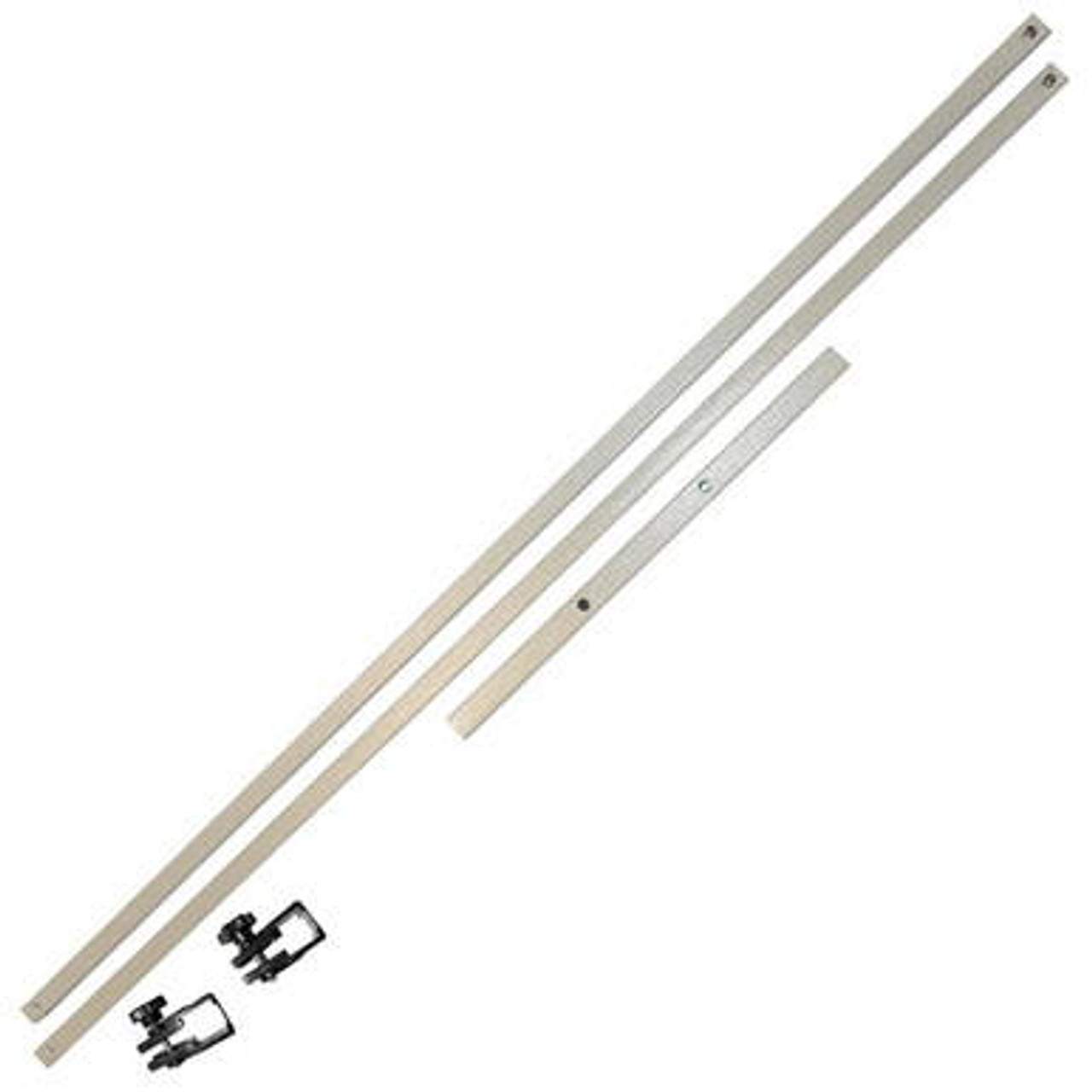 In conjunction with the Fast Shade Rail Skirts, the 10' (3.05 m) Rail Skirt Steel Fitting hardware creates a half-wall between two legs. The cross bar is made up of 3 separate push-pin poles, with clamps for each end that wrap around the frame leg. To install a skirt, the bar is inserted into a pocket on the skirt, attached to the clamps, and then wrapped around each leg.
