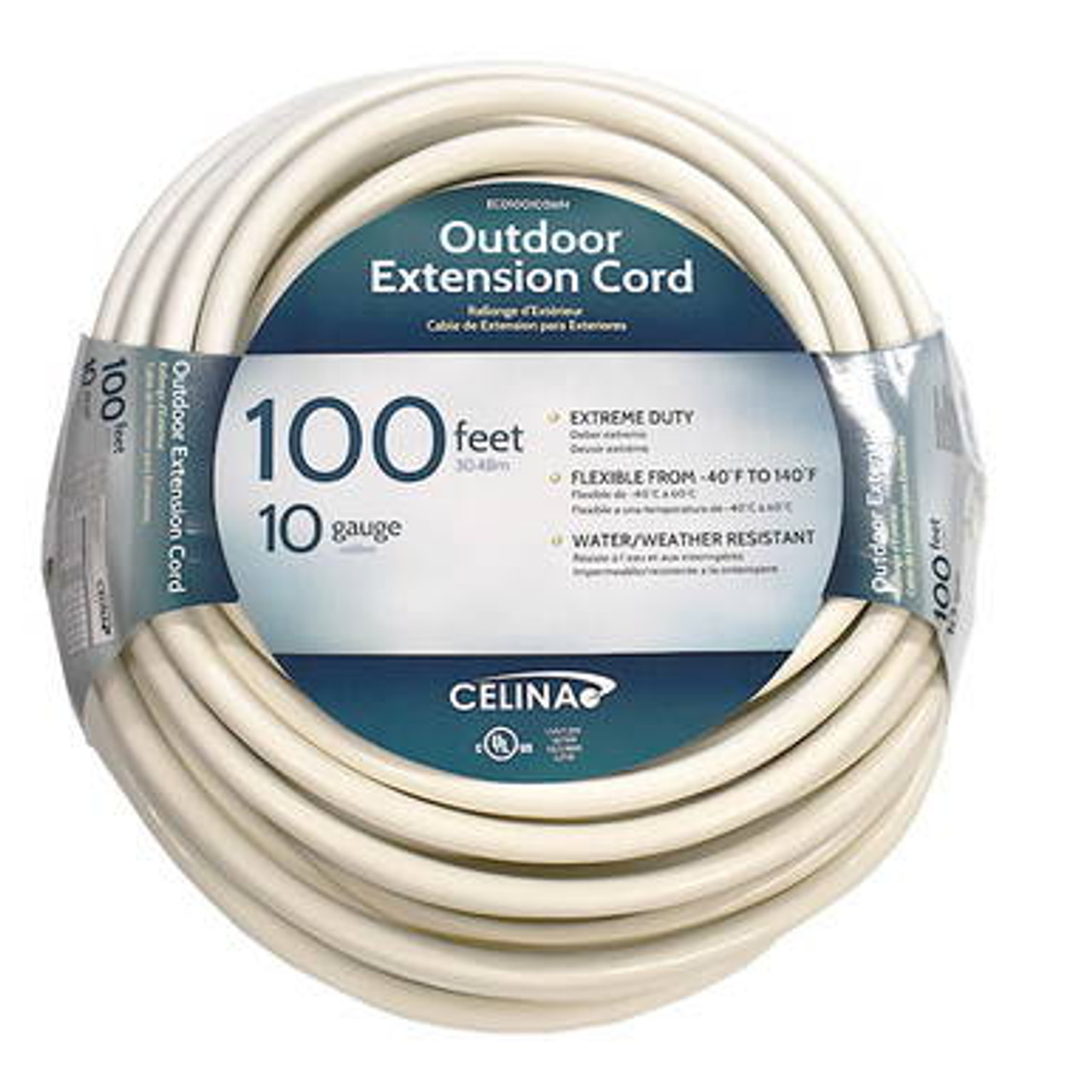 CELINA's 100' (30.5 m) White Extension Cord accepts a single 3 prong cord. This Extension Cord is a 10/3 cord which is rated at 15 amps - 125 volts and molded with a cold weather jacket that is rated for temperatures as low as -40 degrees Fahrenheit (-40 Celsius). The CELINA Extension Cord is also water & flame resistant.