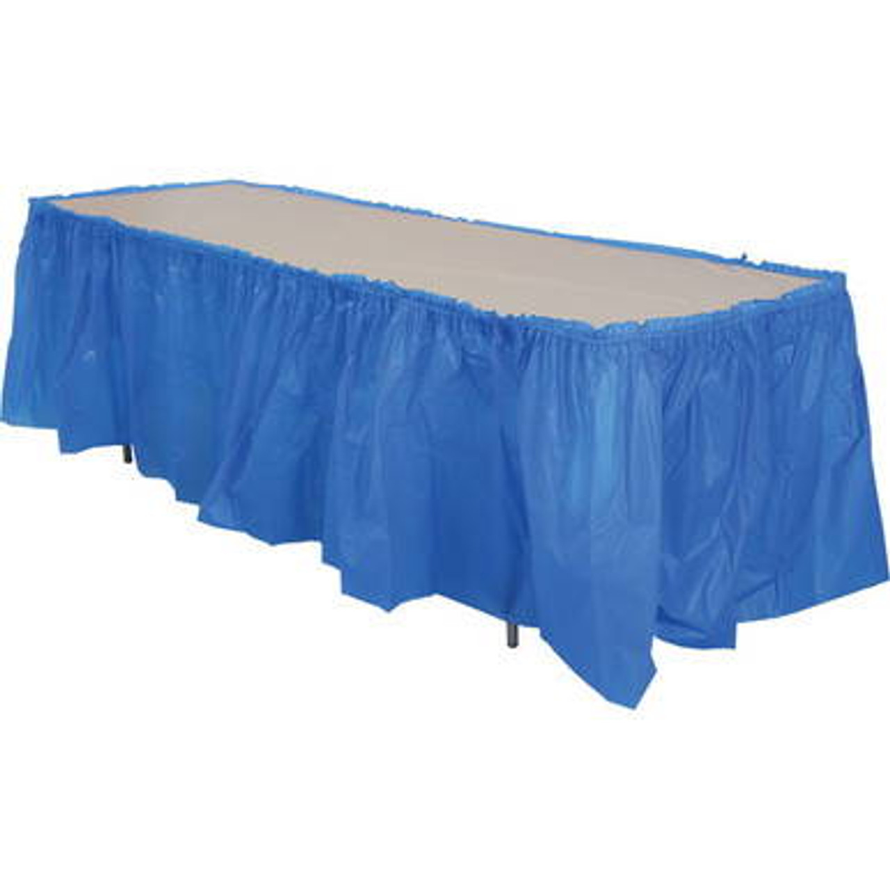 Plastic table skirts offer an inexpensive alternative to traditional cloth skirts. Event planners, caterers, and budget friendly brides will love the formal feel our Plastic Tableskirt provides. Perfect for meetings, parties, fundraisers, school dances, and any number of special events, tableskirts measure 14 feet x 29 inches and can accommodate 3 sides of a 6 to 8 foot banquet table as well as smaller rounds.  This product offers a simple way to add some flare without the hassle of rental fees and worries over stains, the plastic tableskirts can be simply disposed of at the end of the event.