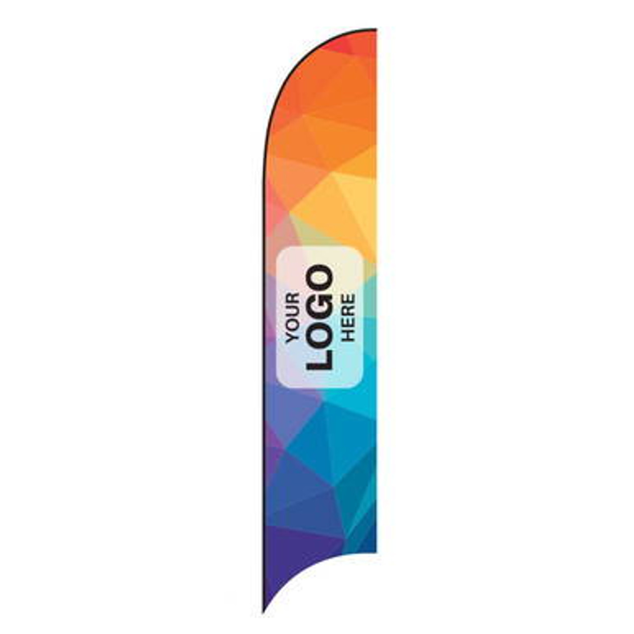 Our Single Sided Blade Flags are perfect for any occasion! These sturdy single sided flags are constructed with grommets and a black 500 Denier polyester edge. Each is made using our top of the line direct disperse printing process, allowing the high definition graphic to be sublimated with full penetration of color with no color limitations. Single sided flags are designed to bleed through the material leaving a mirror image on the back or reverse side. Great for trade shows, conventions, point of purchase (POP), exhibitions, conferences, promotion events, shopping centers, retailers, and much more! Specifics include: