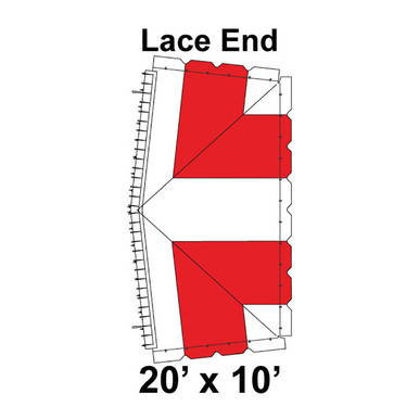 20 x 10 Classic Frame Tent Lace End 16 oz Ratchet Top White and Red is a sectional roof end designed for Classic Frame tent systems that use lace-in roof connections with ratchet tensioning. Sized to fit a 20 foot wide by 10 foot long end bay, this lace end panel is used in combination with compatible mid roof sections to complete a sectional Classic Frame tent layout.