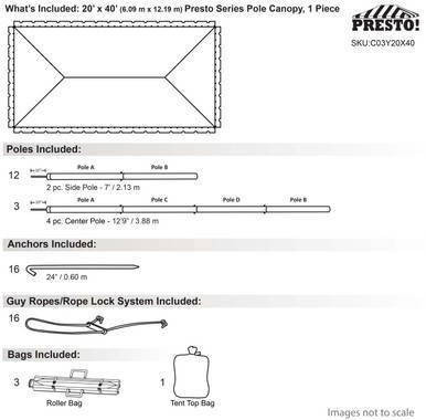 20 x 40 Presto Series Pole Canopy — 1-Piece Tent Top, Complete Kit Fast Setup. Practical Value. Clean Presentation.Give your event dependable coverage and a classic look with the 20' x 40' Presto Series Pole Canopy from CELINA. Built for straightforw…