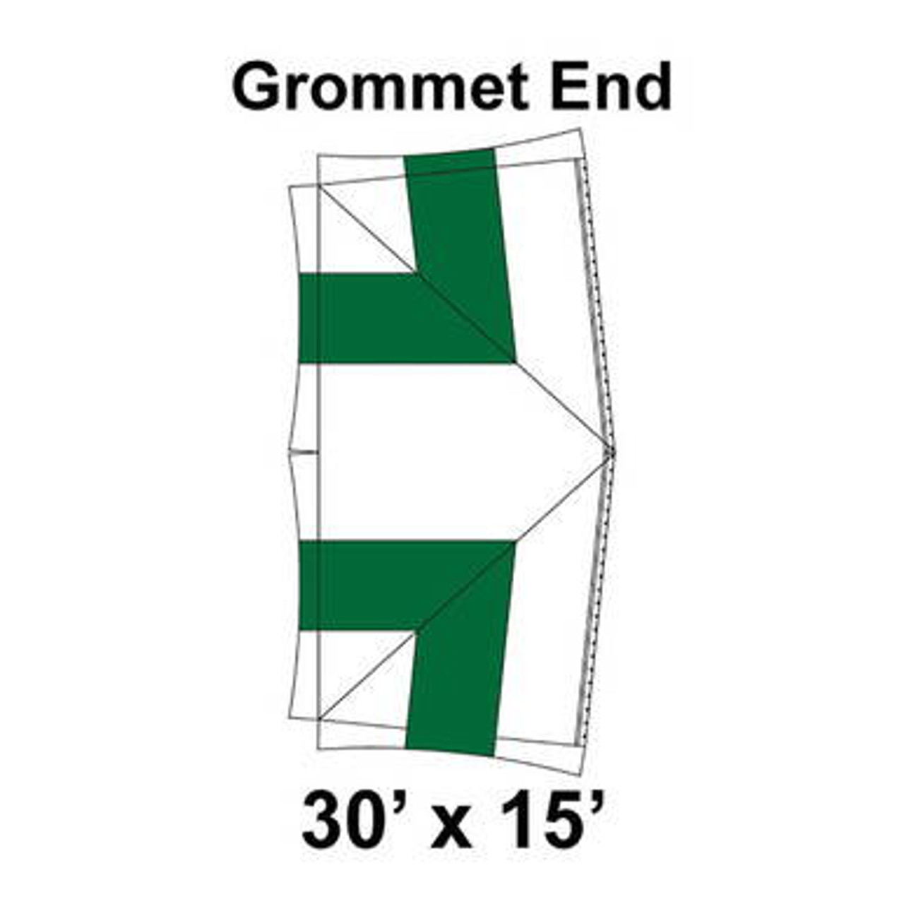 30' x 15' Master Series Frame Tent Grommet End, 16 oz. Ratchet Top, White and Forest Green
