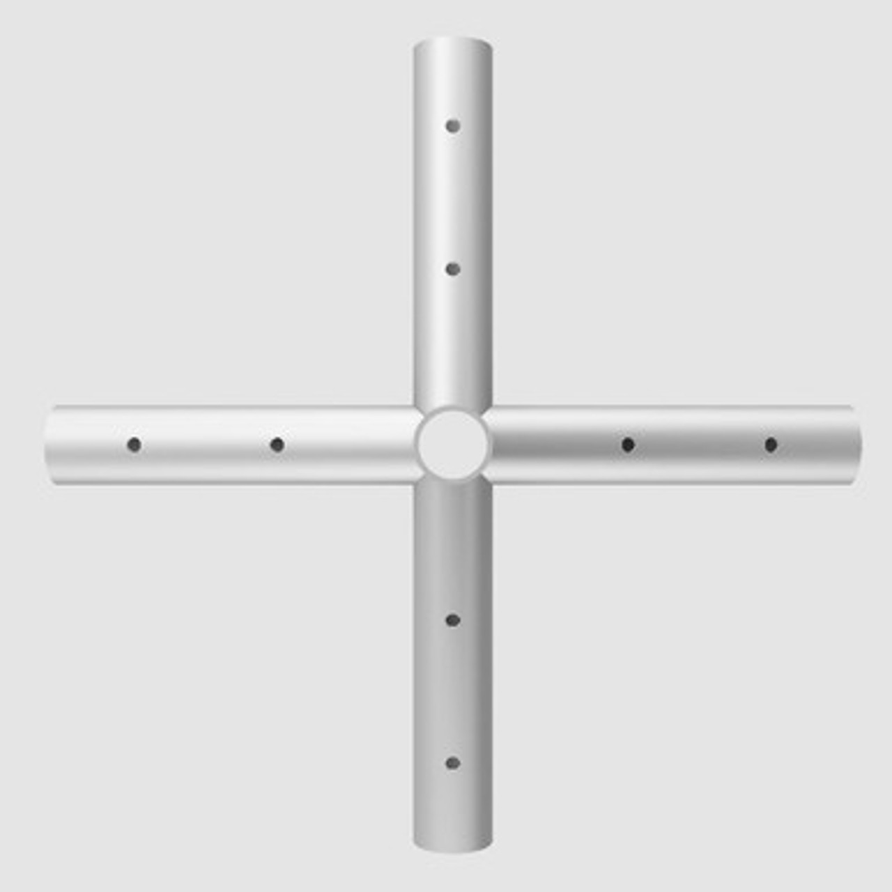 A 4 Way Crown fitting is used on smaller, square-shaped West Coast Style Frame Tents such as an 8' x 8', 10' x 10', or 15' x 15' frame tent. The protrusions on the 4 Way Crown extend toward each of the corner fittings on the tent frame. West Coast Style Frame Tent Fittings are manufactured from 1.25" schedule 40 steel pipe and finished with zinc plating.