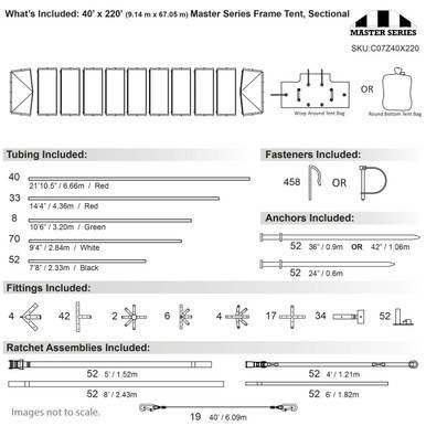 Reach unparalleled scale, modular efficiency, and commercial-grade reliability with the 40 x 220 Master Series Frame Tent — Sectional Tent Top Complete Kit, designed for the largest and most demanding professional event environments.