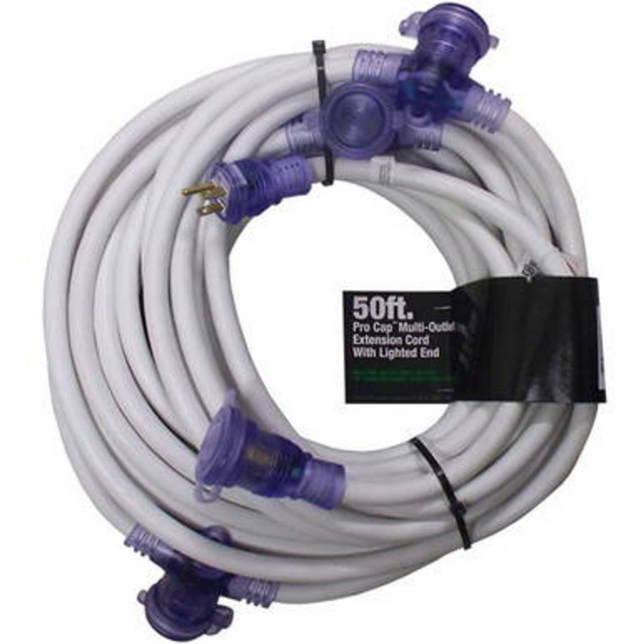 CELINA's 50' (15.24 m) Multi-Cap Extension Cord features 5 outlets, spaced every 10' (3.05 m). Each outlet has a cover that keeps out dust, dirt, and moisture. This Multi-Cap Extension Cord is a 12/3 cord rated at 15 amps - 125 volts and molded with a cold weather jacket rated for temperatures as low as -40 degrees Fahrenheit (-40 Celsius). The CELINA Multi-Cap Extension Cord is also water and flame resistant.