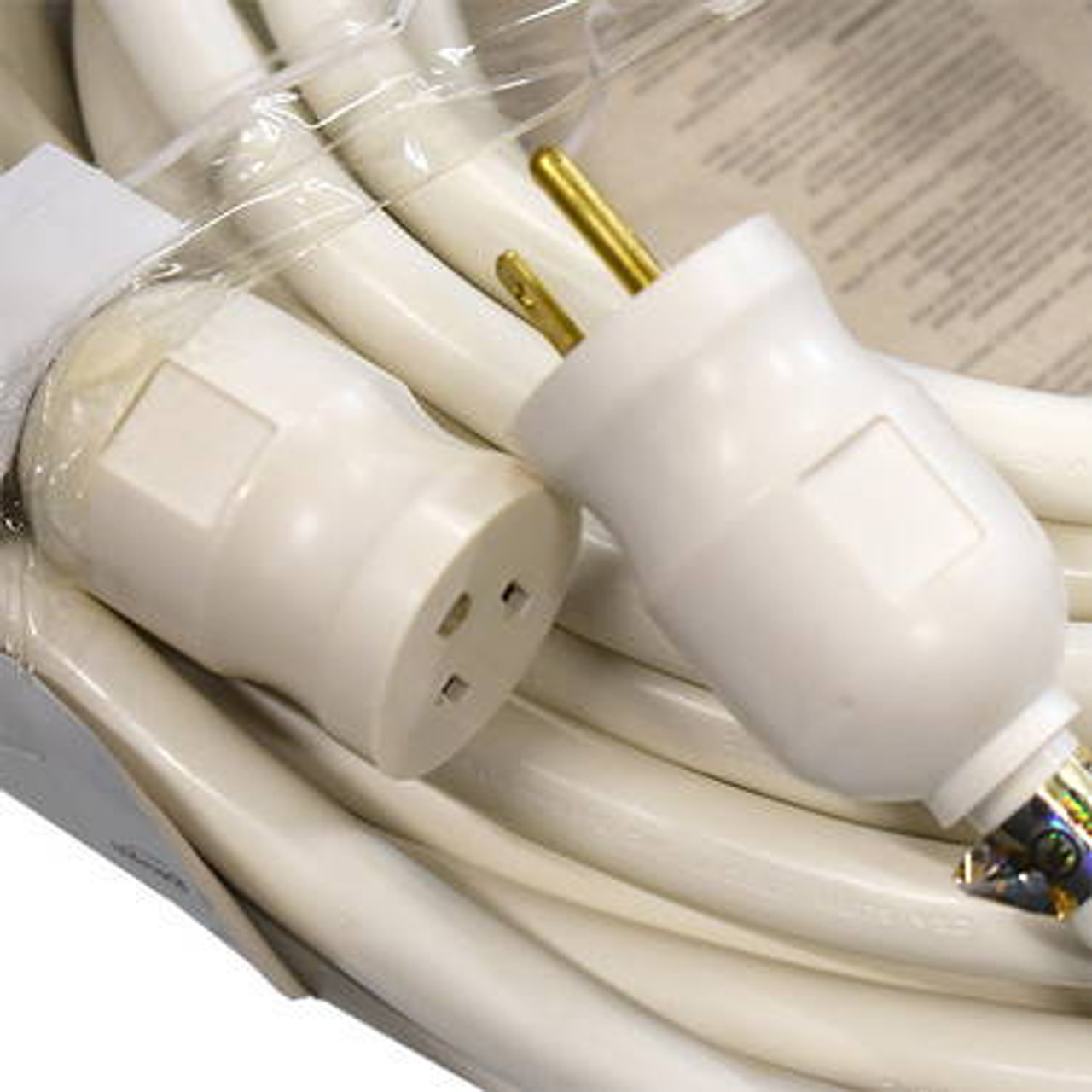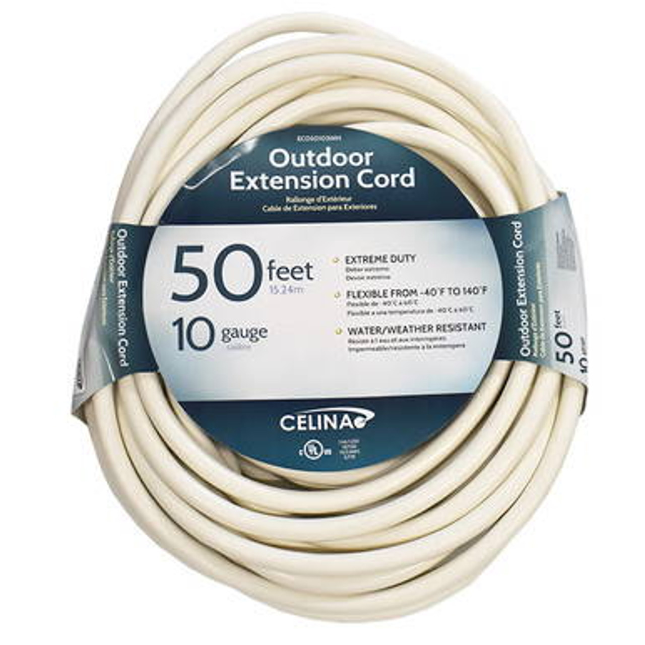 CELINA's 50' (15.24 m) White Extension Cord accepts a single 3 prong cord. This Extension Cord is a 10/3 cord which is rated at 15 amps - 125 volts and molded with a cold weather jacket that works in temperatures as low as -40 degrees Fahrenheit (-40 Celsius). The CELINA Extension Cord is also water & flame resistant.