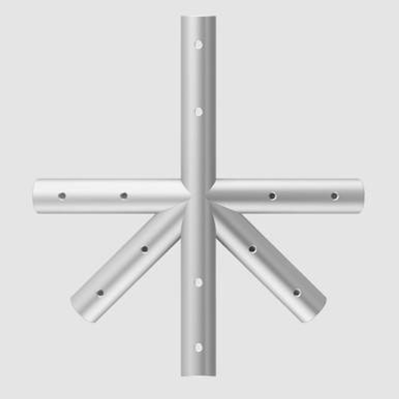 Used in 40' wide West Coast Style Frame Tents, a 6 Way Hip Joint Fitting connects the tubing that leads from the crown fittings to the tubing that extends from the corner and side tee fittings at the tent frame perimeter. Located at the mid point along the hip rafters, a total of 4 6 Way Hip Joint Fittings is used per tent. Each fitting is manufactured from 1.25" schedule 40 steel pipe and finished with zinc plating.