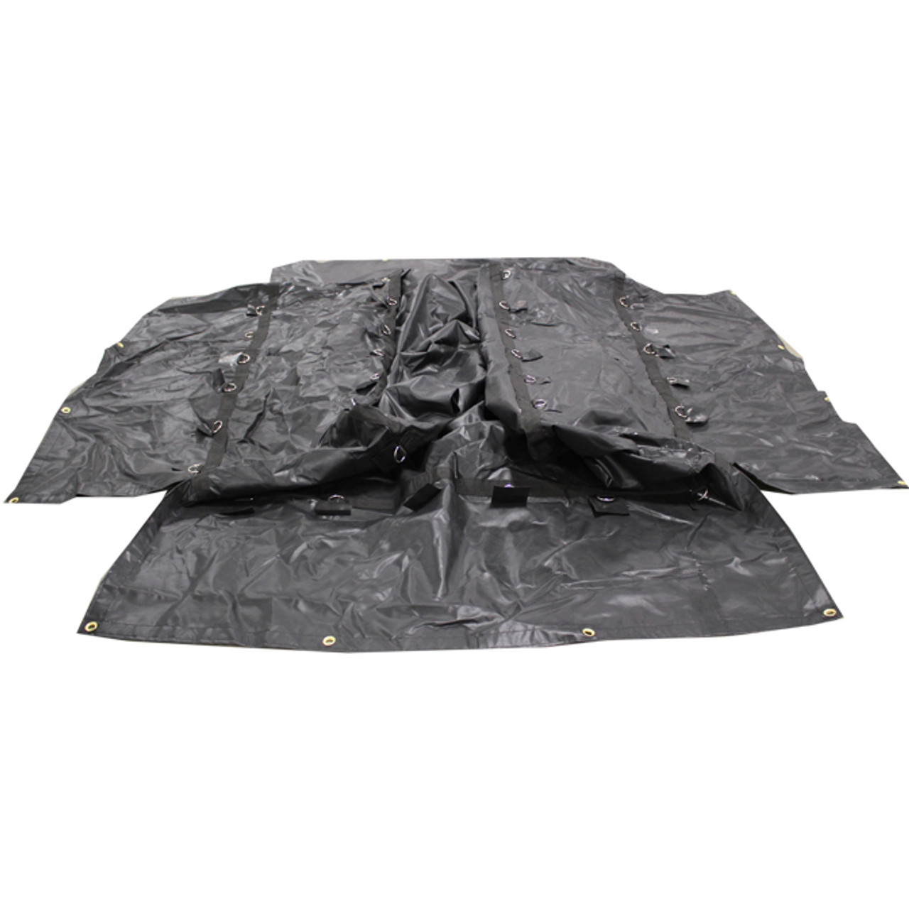 Construction Materials: | 18 oz. 1000 x 1000 Denier Black Vinyl #3 Brass Grommets 2" (5.1 cm) Galvanized Steel D-Rings |