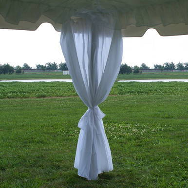 The 7' x 40''; Leg Drape with Sash is made of 100% polyester flame resistant fabric. Leg drapes provide a decorative option to cover up those metal poles. This style of leg drape attaches to the sidewall rope that is sewn in the top of a tent.