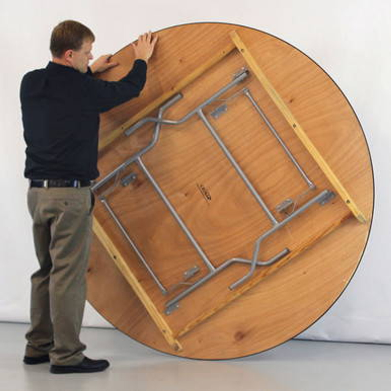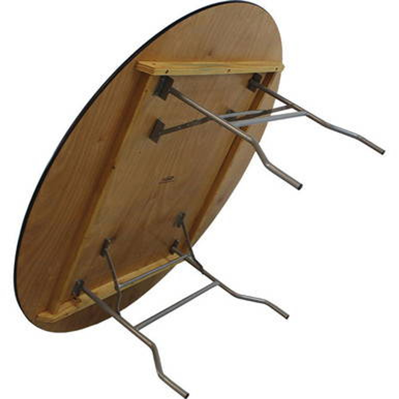 CELINA's largest Round Wooden Table is 72" (1.83 m) in diameter, allowing your event to seat 8 to 10 people at a single table. The powder-coated steel legs are attached with bolt-through construction, and the table top is further reinforced with hardwood runners to combat warping over time. The wooden top is treated with two coats of UV-cured lacquer, with a protective strip around the outer edge for extra protection from scraping and bumps. Great for small meeting or large banquets alike, these tables are durable enough to last for years. The listed price is per table; a minimum of 6 tables is required per order.