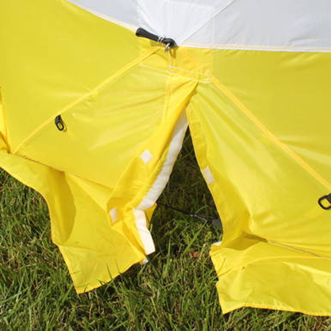 Quick setup from the inside or outside with fiberglass rod frame. Utility shelter springs from a bag into a full size tent in seconds. Made from water-resistant, flame-retardant and UV-treated material. One large door and two large windows offer easy acces…