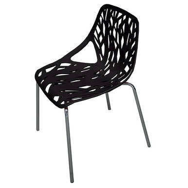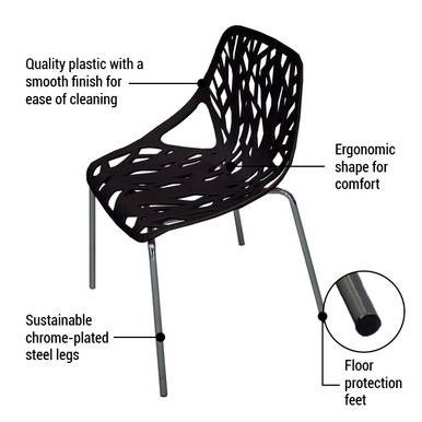 The Black Parma Birch Stencil Chair gives you the eye-catching birch tree design made from economical polypropylene plastic. Supported by chrome plated steel legs, the Parma chair is easily assembled by screwing the base legs to the bottom of the chair's seat. Each leg ends in a small non-marking foot to protect hard flooring.
