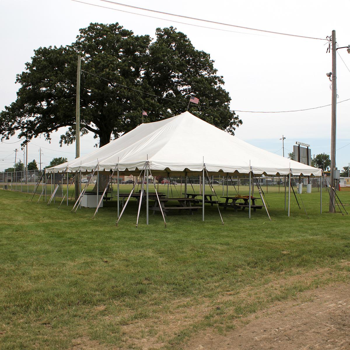 Pole tents include center poles that require thoughtful table placement, but they do not significantly reduce overall capacity.