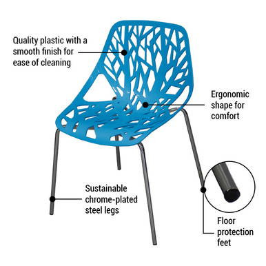 For the innovative art lover, the Parma Birch Stencil Chair lets you combine your love of the visual arts with the usefulness of comfortable seating! The sturdy chrome-plated legs are bolted to the underside of the polypropylene plastic seat, giving you a lightweight and stackable chair that looks great in any venue.