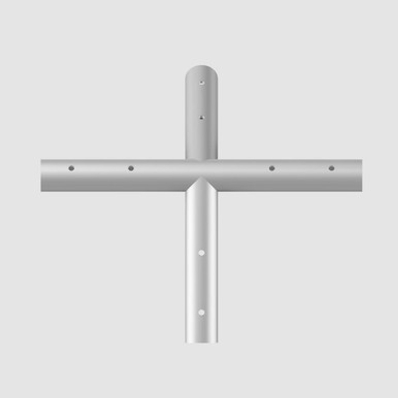 A Ridge Crown Fitting is used in rectangle-shaped West Coast Style Frame Tents that require 2 or more ridge or top spreaders. These will be extend between two 3 Way or 6 Way Crowns, with protrusions extending toward each of those crowns, and two that angle down to side tee fittings along the perimeter of the frame. Each West Coast Style Frame Tent Fitting is manufactured using 1.25" schedule 40 steel pipe and finished with zinc plating.